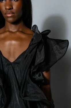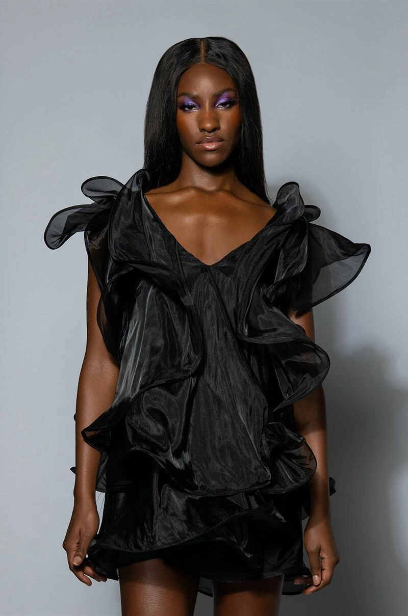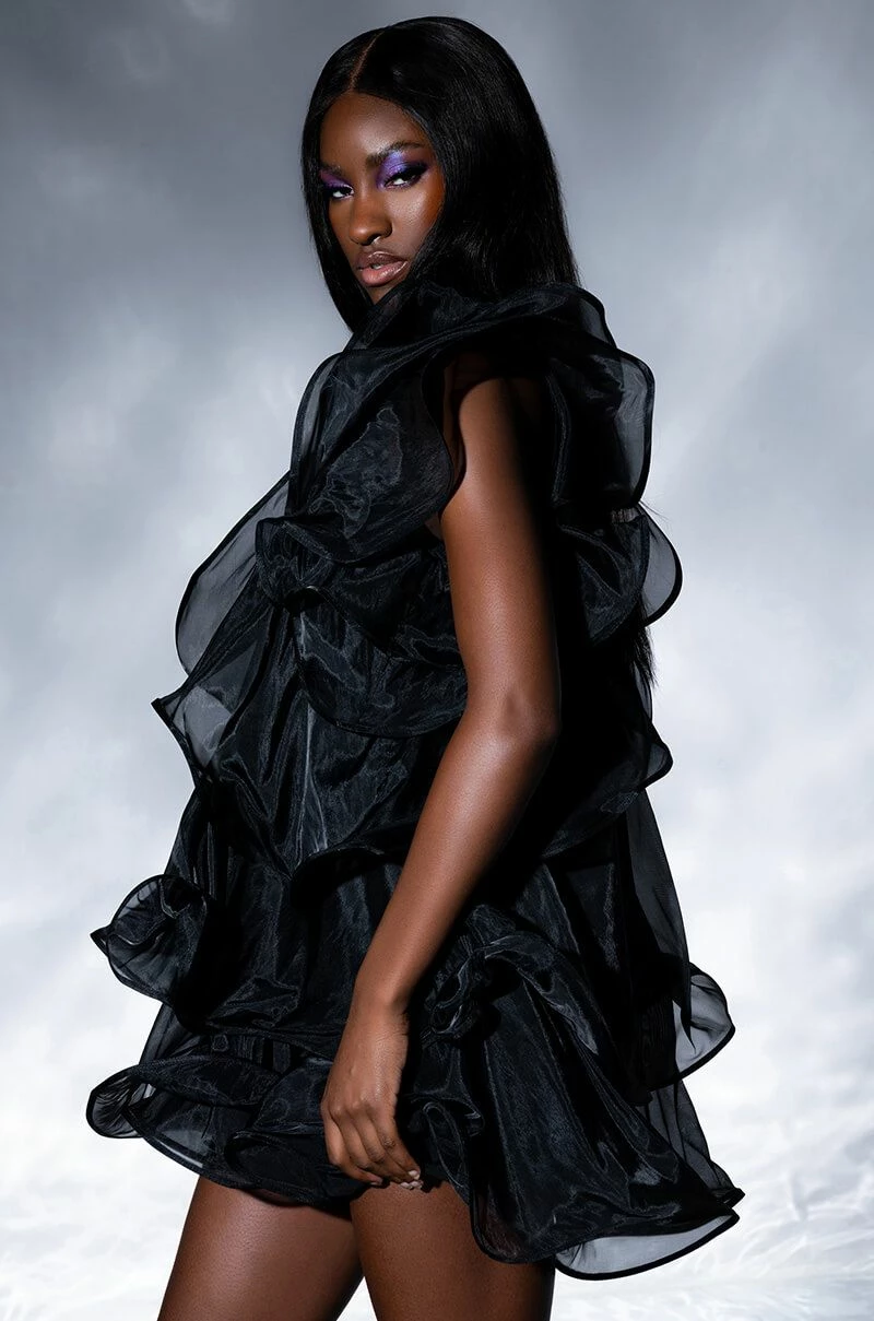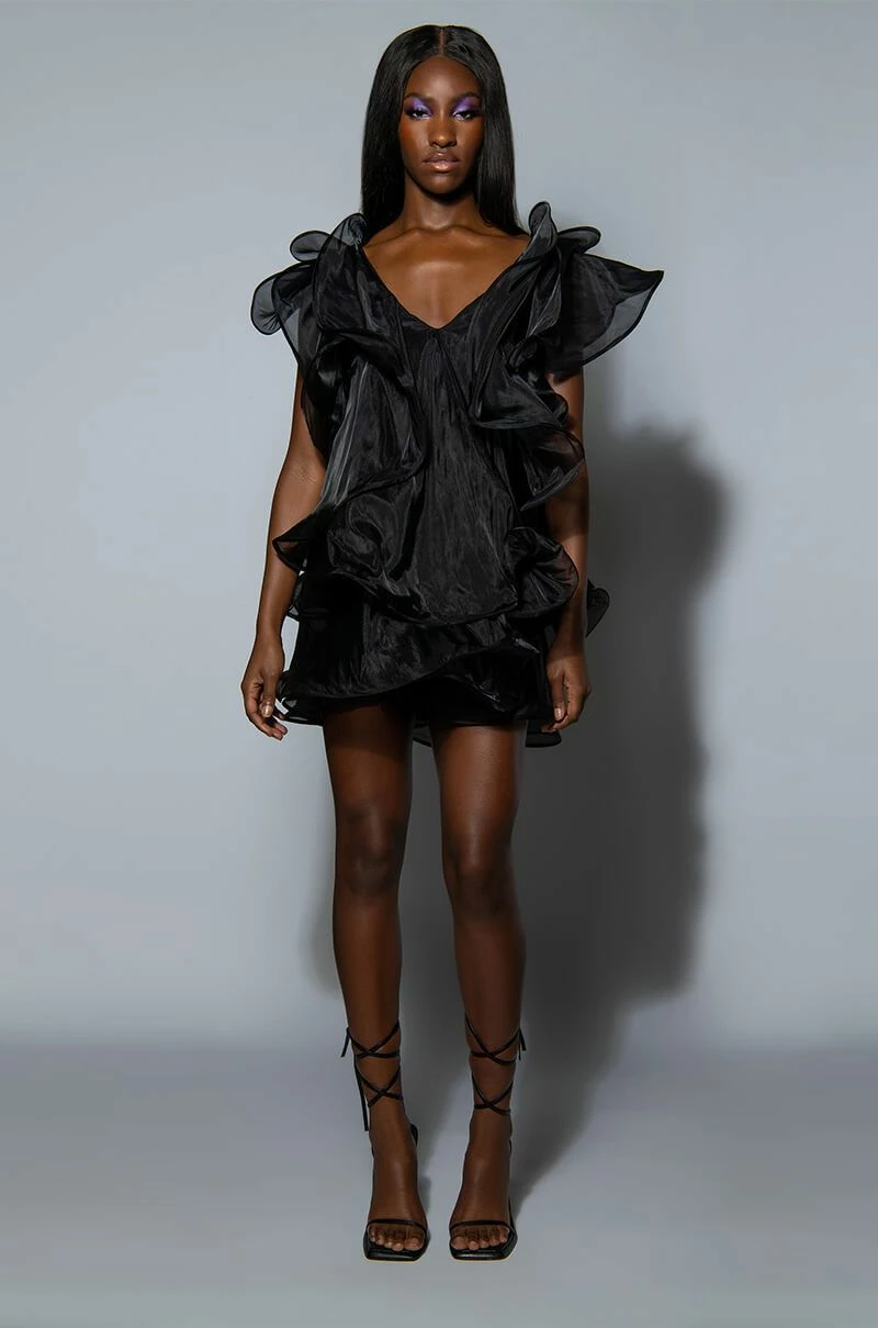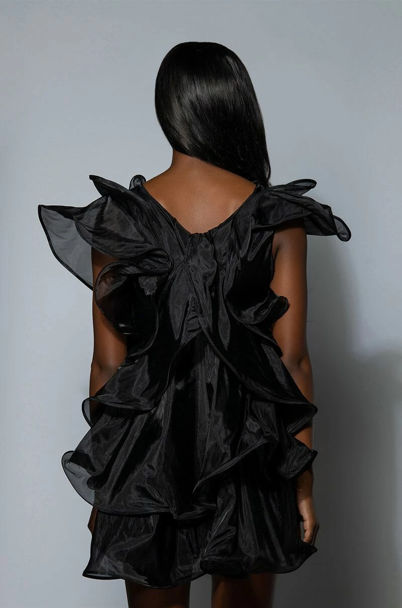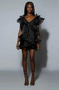 The AKIRA Label Walking On The Moon Tiered Ruffle Shift Mini Dress is made from a slick, lightweight fabrication and features a V neckline, reinforced tiered ruffle detailing, a mini length silhouette, a flared skirt with an inner slip, and a slip-on fit.