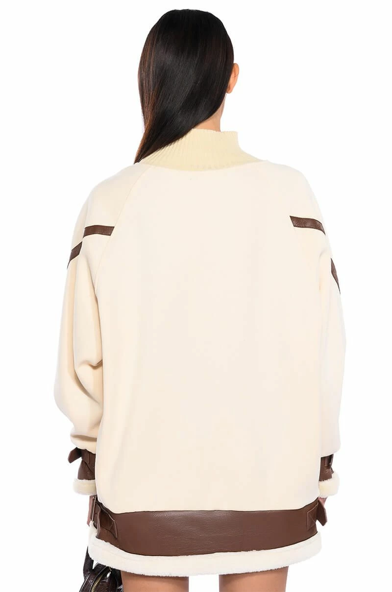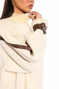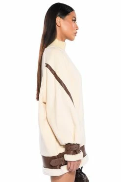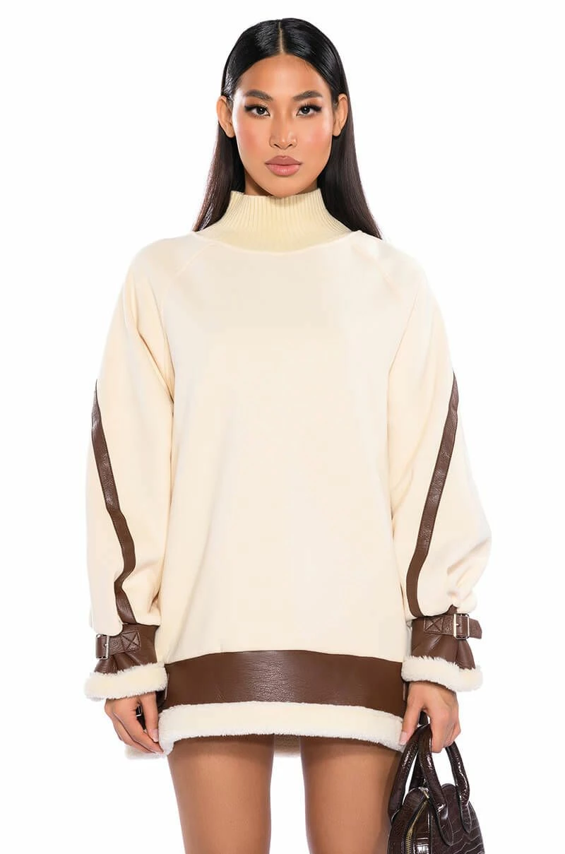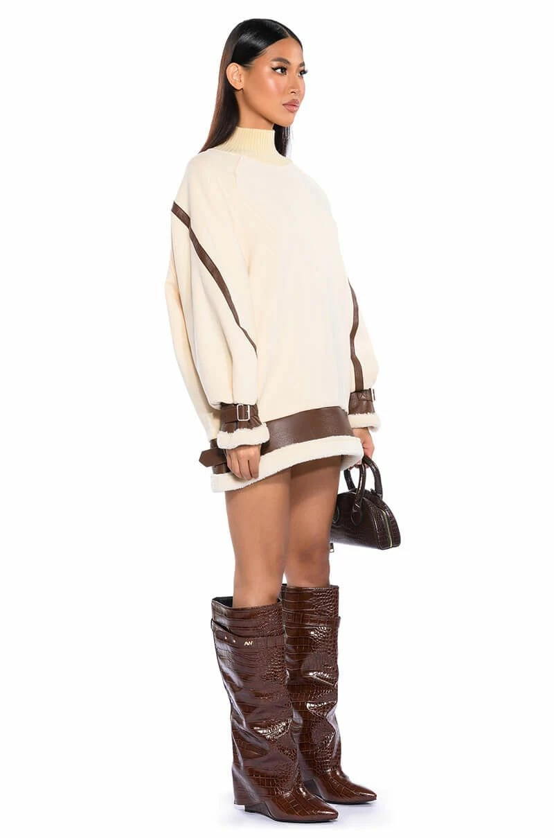 The AKIRA Label Waste My Time Pull Over Mini Dress In Beige is made from a cozy sweatshirt fabrication and features a ribbed knit mock neckline, long sleeves with vegan leather trim and belted faux fur cuffs, a belted vegan leather and faux fur trim hem, fuzzy lining, a boxy fit, a mini length silhouette, and a pull-on fit. Pair this piece with thigh high boots and a long trench to complete your look.
