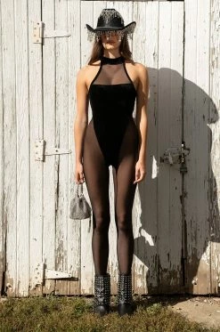 Take care of business in The AKIRA Label Watch Me Work Mesh Detail Sleeveless Catsuit. This sheer mesh one piece features a sleeveless silhouette, a mock neckline, attached skinny leg pants, a sexy bodycon fit, and a high cut velvet bodysuit overlay. Style this piece under a jean jacket and denim shorts for a sexy layered look.