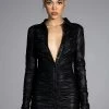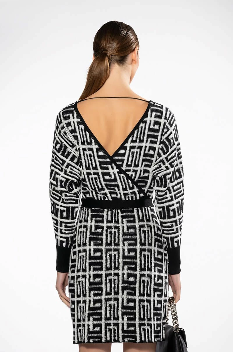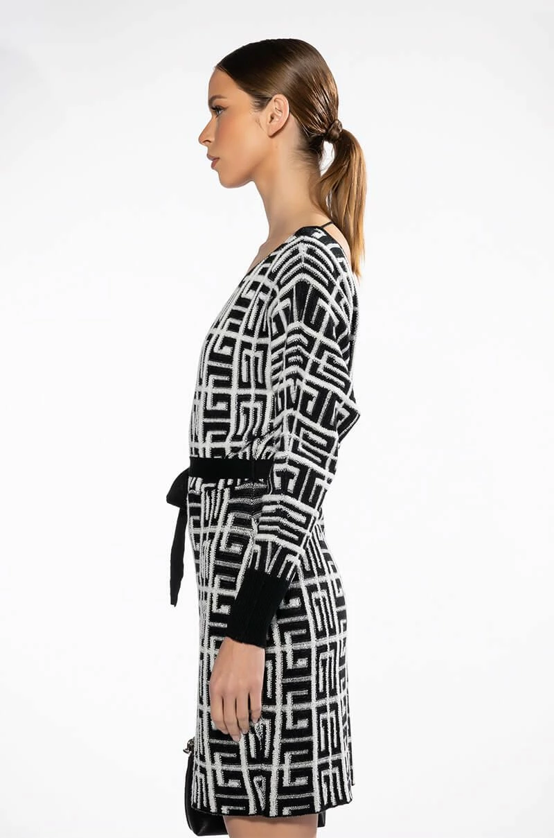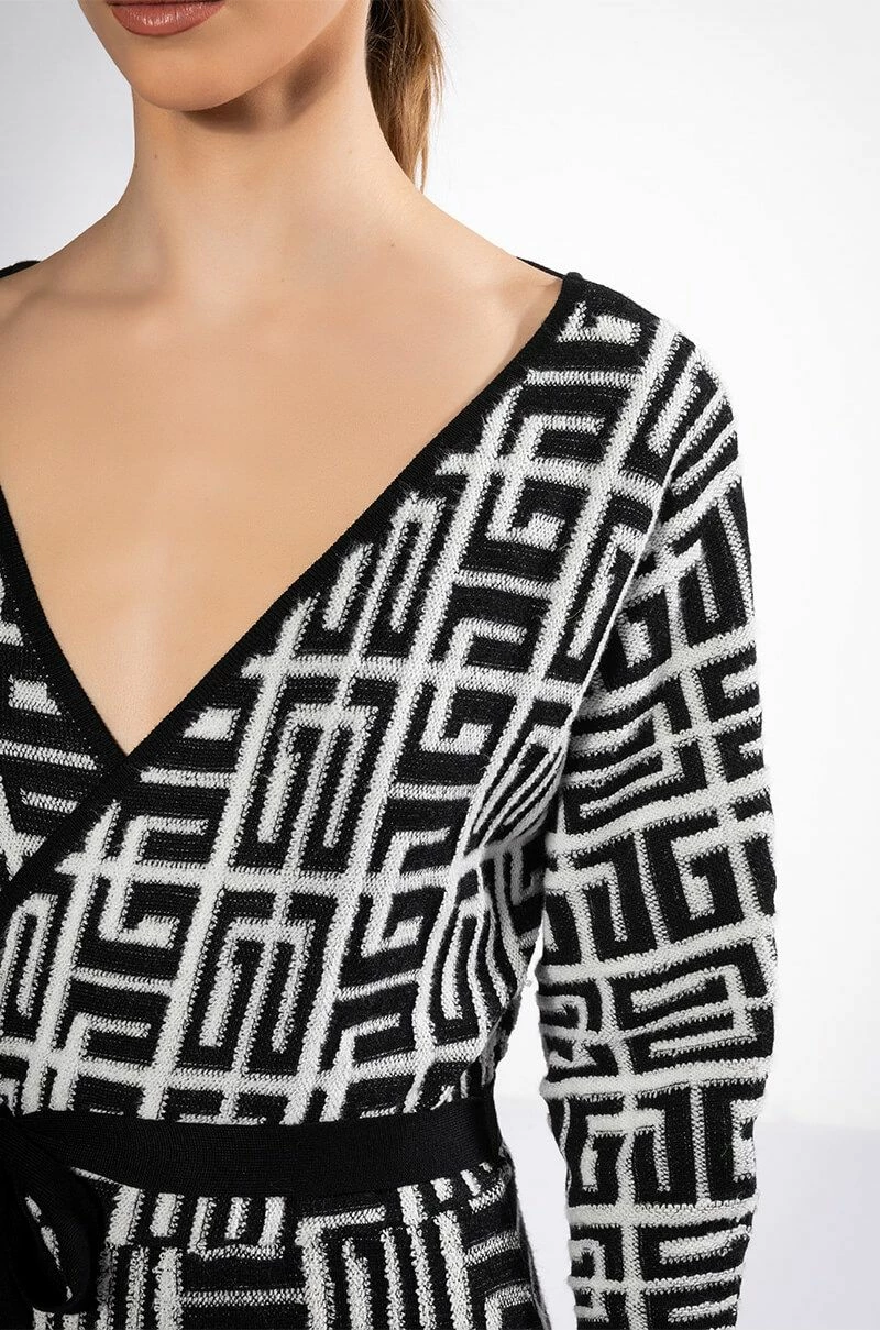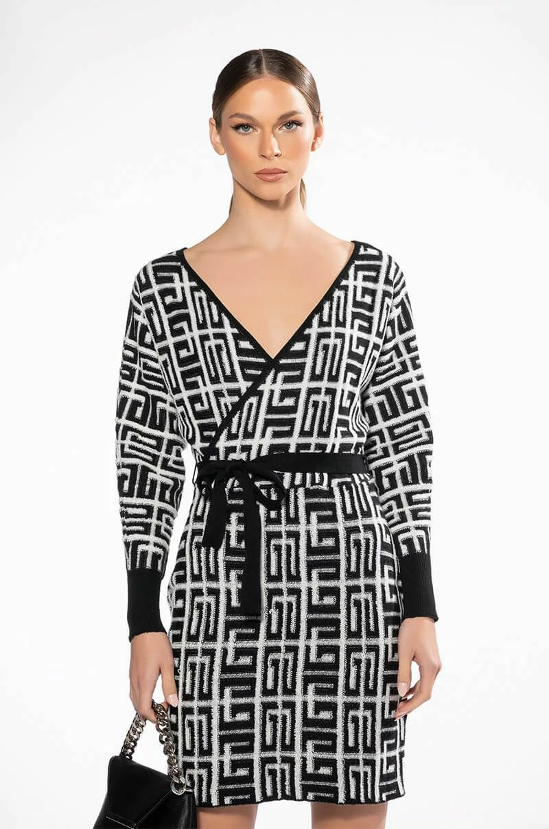 The AKIRA Label Wrap Front Geometric Knit Mini Dress is made from a cozy knit fabrication and features a meandering pattern, a wrap front neckline, long sleeves, a mini length silhouette, working belt loops, a coordinating waist tie, and a pull-on fit.