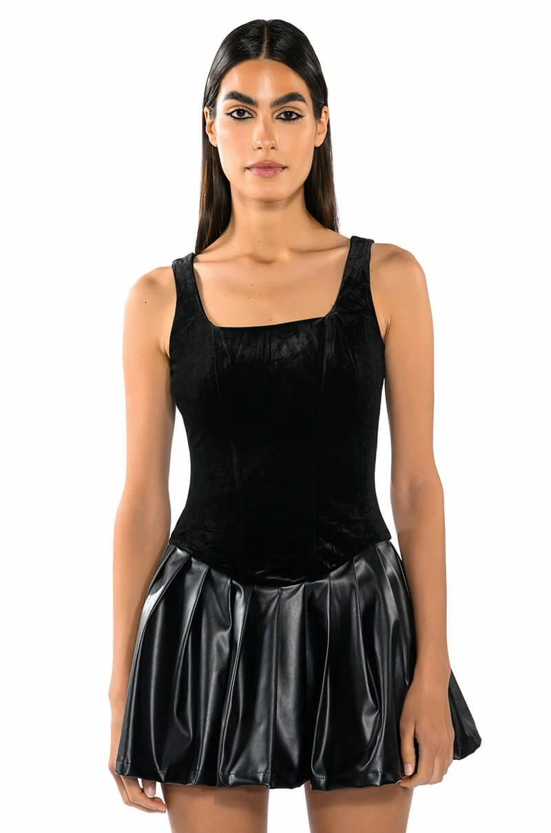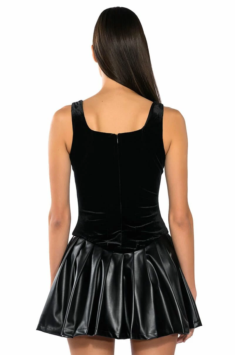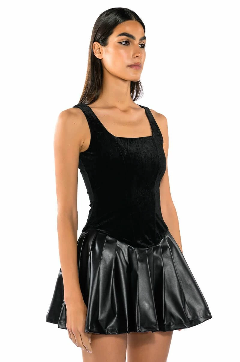 If this is wrong, we don’t wanna be right. The AKIRA Label Wrong Decisions Pleated Mini Dress in Black features a velvet base, a square neckline, wide tank straps, and an attached pleather pleated skirt. Complete with a mini length silhouette, and a smooth, stretchy inner skort lining for comfort and coverage
