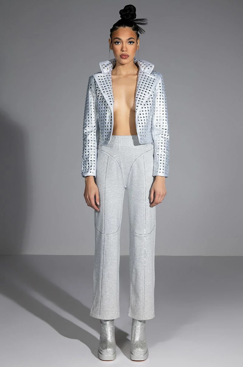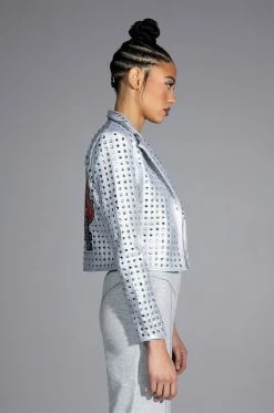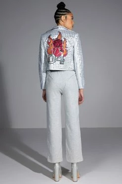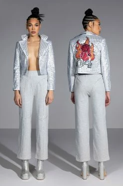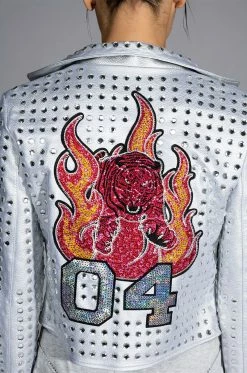 The AKIRA Label Year Of The Tiger Silver Metallic Rhinestone Moto Jacket is an ultra-glam piece featuring a faux leather base, a fold over notch lapel collar, glimmering rhinestone stud detailing throughout, an elaborate rhinestone-embellished flaming tiger back patch accent, and sequin embroidered “04,” lettering. Complete with long sleeves, a slightly cropped cut, a satin inner lining, and an open front design.