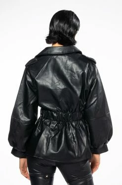 The AKIRA Label Yoko Peplum Belted Moto Jacket features a supple faux leather fabrication, a studded notch collar, studded shoulder epaulets, long blouson sleeves, slant side pockets, a front zipper closure, and an elasticized waistband. Complete with a belt buckle front closure, a peplum design, a waist-length silhouette, and a satin inner lining.