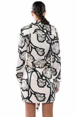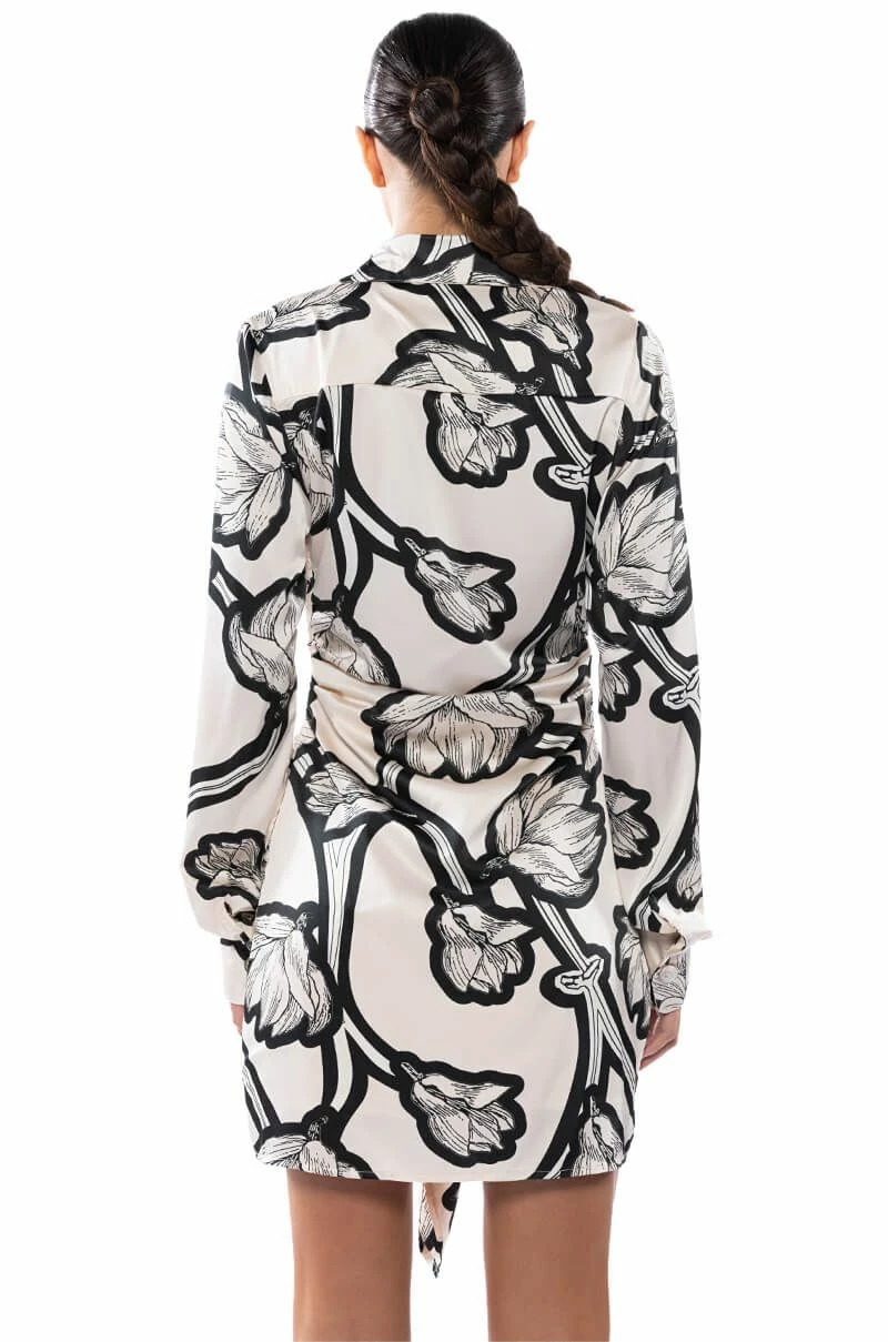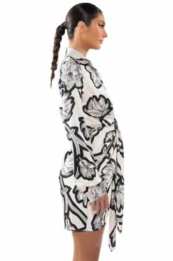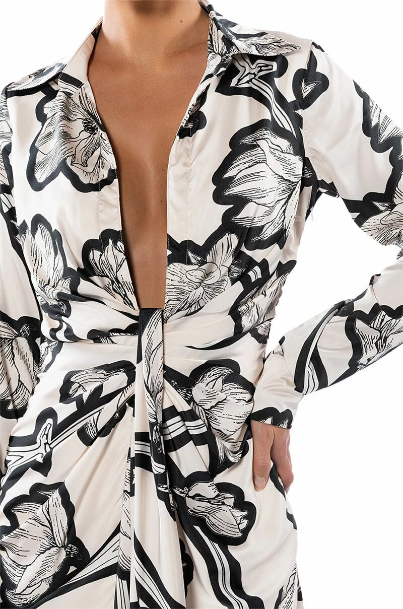 The AKIRA Label Yours Truly Long Sleeve Mini Dress In Black White is a long sleeved, satin-based shirt dress complete with a plunging neckline, a folded collar, a curve skimming fit, draped-front detailing, and a mini length hem. Pair with your favorite slip on platform mules and chunky earrings to complete the look.