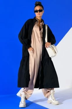 The AKIRA Label Yours Truly Oversized Short Sleeve Jumpsuit is a sleek one piece featuring a satin fabrication, a fold over collar, a plunging neckline, boxy short sleeves, on seam side pockets, an oversized fit, and a wide leg silhouette. Pair this piece with platform booties to complete your look.