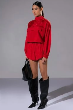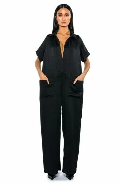 The AKIRA Label Yours Truly Oversized Short Sleeve Jumpsuit is a sleek one piece featuring a satin fabrication, a fold over collar, a plunging neckline, boxy short sleeves, on seam side pockets, an oversized fit, and a wide leg silhouette. Pair this piece with platform booties to complete your look.